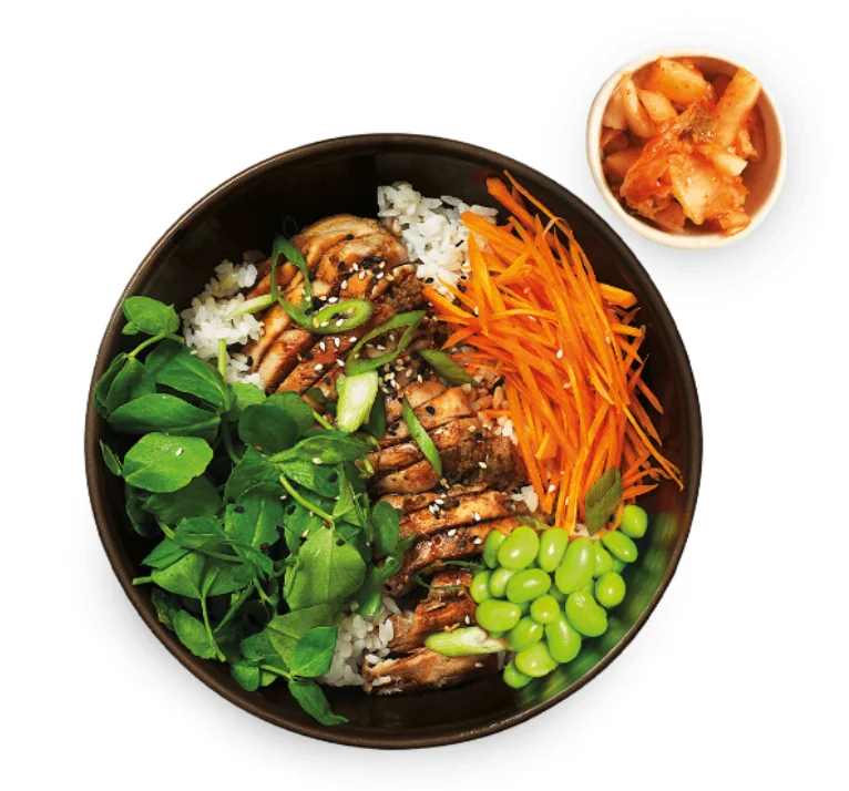 Chicken in Teriyaki Sauce | Sticky White Rice | Carrots | Pea Shoots | Edamame Beans | Spring Onion | Sesame Seeds | Side of Kimchee