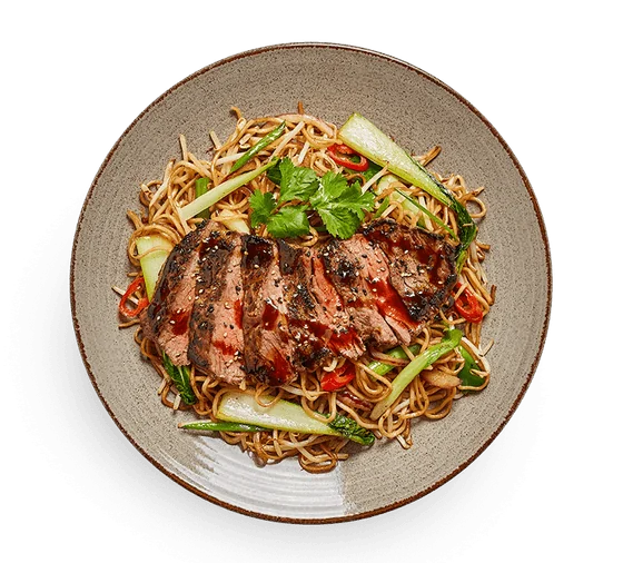 Soba noodles in teriyaki sauce + curry oil | steak | mangetout | bok choi | onion | chilli | beansprouts | coriander | sesame seeds