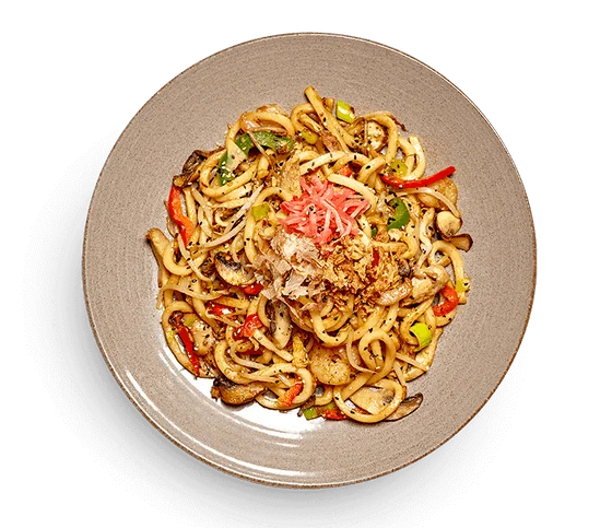 The Wagamama Yaki Udon is a hearty and flavourful stir-fry featured on the Wagamama Noodles Menu in the UK. It combines thick udon noodles with tender chicken and juicy prawns, all tossed in curry oil with egg, beansprouts, leek, mushrooms, and peppers. Finished with crispy fried onions, pickled ginger, sesame seeds, and bonito flakes, this dish delivers rich umami flavour with a satisfying mix of textures in every bite.